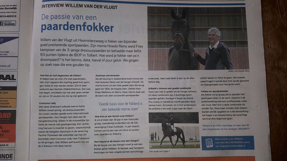 Willem van der Vlugt, fokker en eigenaar van de paarden Eagle en Howdo Remy werd ter ere van zijn jarenlange vrijwilligers werk op CH Gorredijk geïnterviewd. Afgelopen week verscheen het interview in de SA!