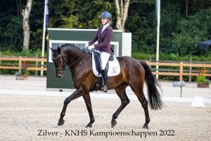 In de finale proef deden Nienke en Nibali er nog een schepje bovenop en scoorden ze, na een fantastische foutloze proef, 71,444%. Hiermee stonden ze lange tijd bovenaan en leek een podiumplaats zeker. De laatste combinatie scoorde echter nog iets hoger, waardoor Nienke tweede werd. We konden het eerst bijna niet geloven! ZILVER op de Nederlandse kampioenschappen met het eerste “veulentje” van onze merrie Jeremy.